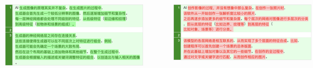 即便是比较复杂的段落,AI 改写起来也是游刃有余。改完之后的文字,除了意思和行文逻辑相同,表述上跟原文基本可以说毫无关系。即便是放到检测工具对比,AI 改写后的段落也显示与原段落没有相同之处。