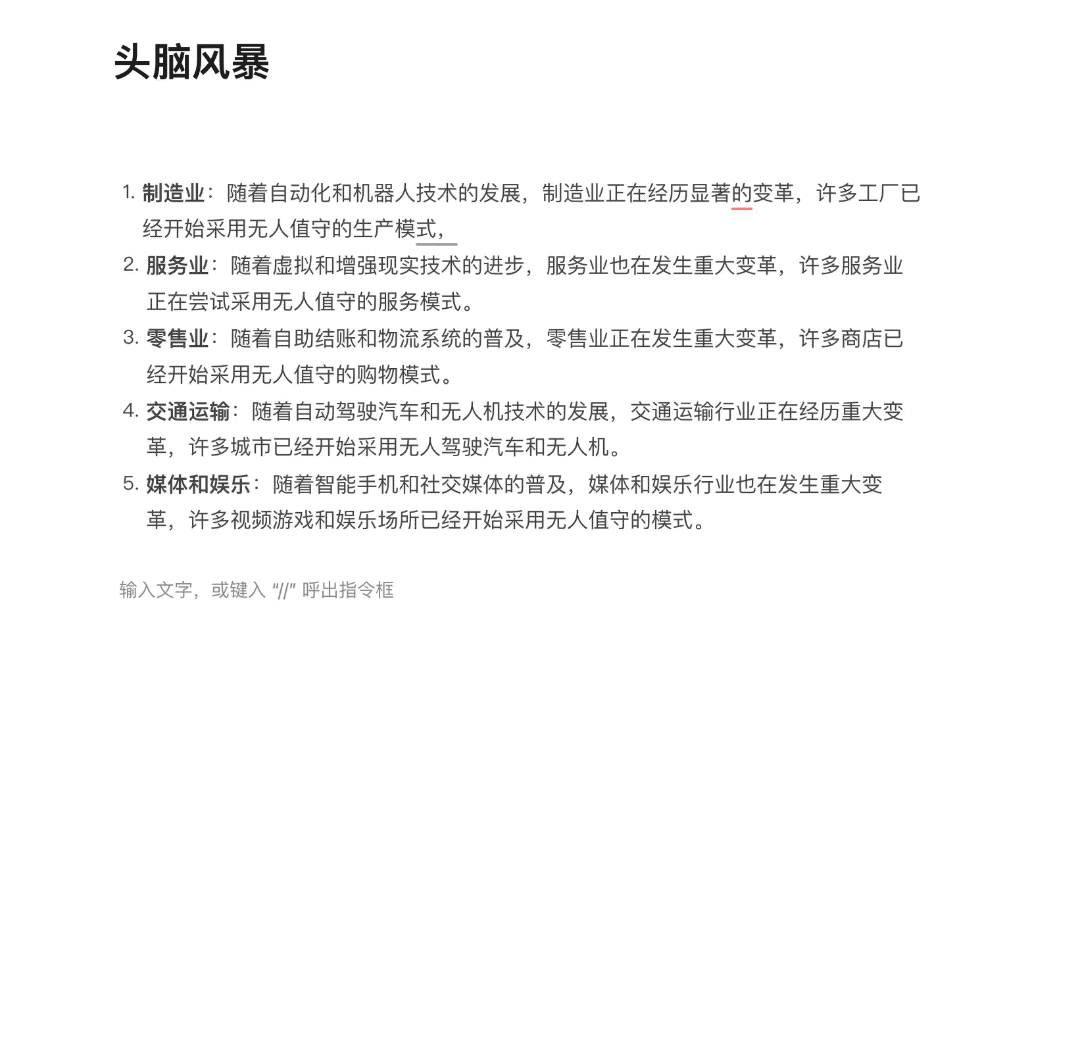 在列出要点以后,我们还可以向 AI 接着提出「制造业应该做些什么努力才能不被取代」一类的问题,了解更多信息,帮助我们更好地进行头脑风暴。AI 提供的这些信息往往能给我们带来许多启示,比如制造业要提高产品质量、寻求创新和转型等。有了这样的基础,我们在头脑风暴时便能够有的放矢,提高效率。