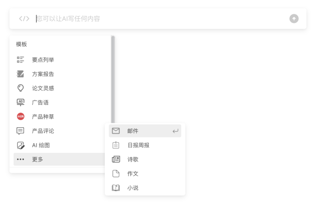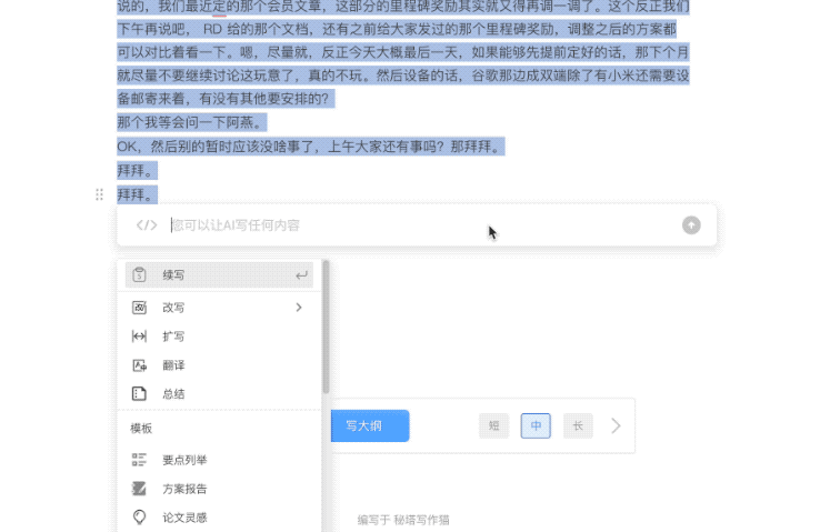 最重要的还是它极低的使用门槛,用户不需要写复杂的 Prompt 才能得到自己想要的答案,写作猫内置的诸多模板就可以应对很多场景下的需求了。就算有更高的要求,在文档输入 // 打开 AI 面板也能让 AI 根据你的需求来创作。