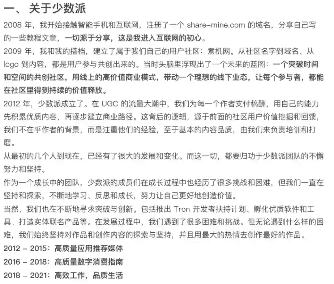 用这样的顺序来介绍一个品牌可以说是非常合适,而我要做的就只有把里面的错误信息进行校对,再根据少数派的实际情况优化其中的部分内容。