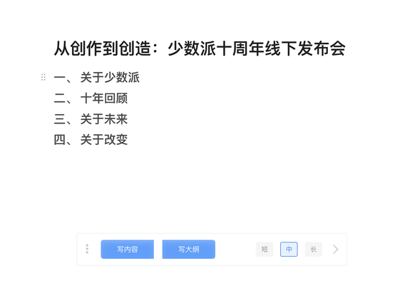 首先,我用「从创作到创造:少数派十周年线下发布会」为标题写了一个大纲。令我非常惊讶的是,秘塔写作猫给的答案竟然跟我们线下发布会的实际演讲流程差不多,都采用了「回顾过去 > 分析现状 > 展望未来」的思路。