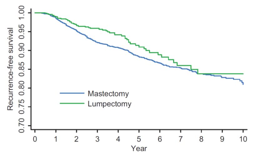 NSABP B-06入组了肿瘤小于4cm的I-II期乳腺癌,随机分成三组:单纯乳房切除术,保乳术,保乳+放疗。所有病人都行腋中下群淋巴结清扫。试验还规定:保乳后若同侧乳腺内肿瘤复发(IBTR),则不计入DFS事件。经过长期随访,保乳+放疗患者与全乳切除患者具有相似的DFS和OS。同时,放疗的加入,显著降低保乳术后肿瘤复发。B-06试验证实了保乳手术的可行性,也肯定了术后放疗的必要性;同期相似设计的Milan-I试验也重复了B-06的结果,两项研究于2002年在NEJM上发表20年随访结果,双星互耀,成为经典。以这些经验试验为基础,中国从90年代起开始尝试保乳治疗,目前上海肿瘤医院保乳率约30%,国内有些中心的数据还更高。经过术前严格评估和术中精确实施的保乳手术,安全性与全切相媲美。