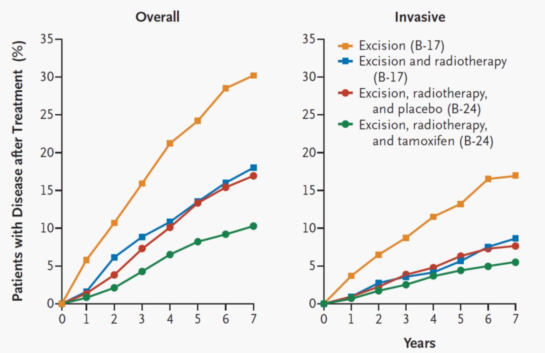 图2:NSABP B-17与B-24结果的联合展示,提示放疗与他莫昔芬是提高ER阳性DCIS保乳术后局控率的重要手段(N Engl J Med 2004;350:1430-41)