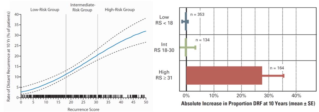 图7:21基因(Oncotype DX)的开发验证基于NSABP B-14与20,左图通过B-14数据确立18与31分作为低危、中危、高危的分界;右图通过B-20数据确立对高危患者化疗获益显著,对中危患者化疗获益不明确。