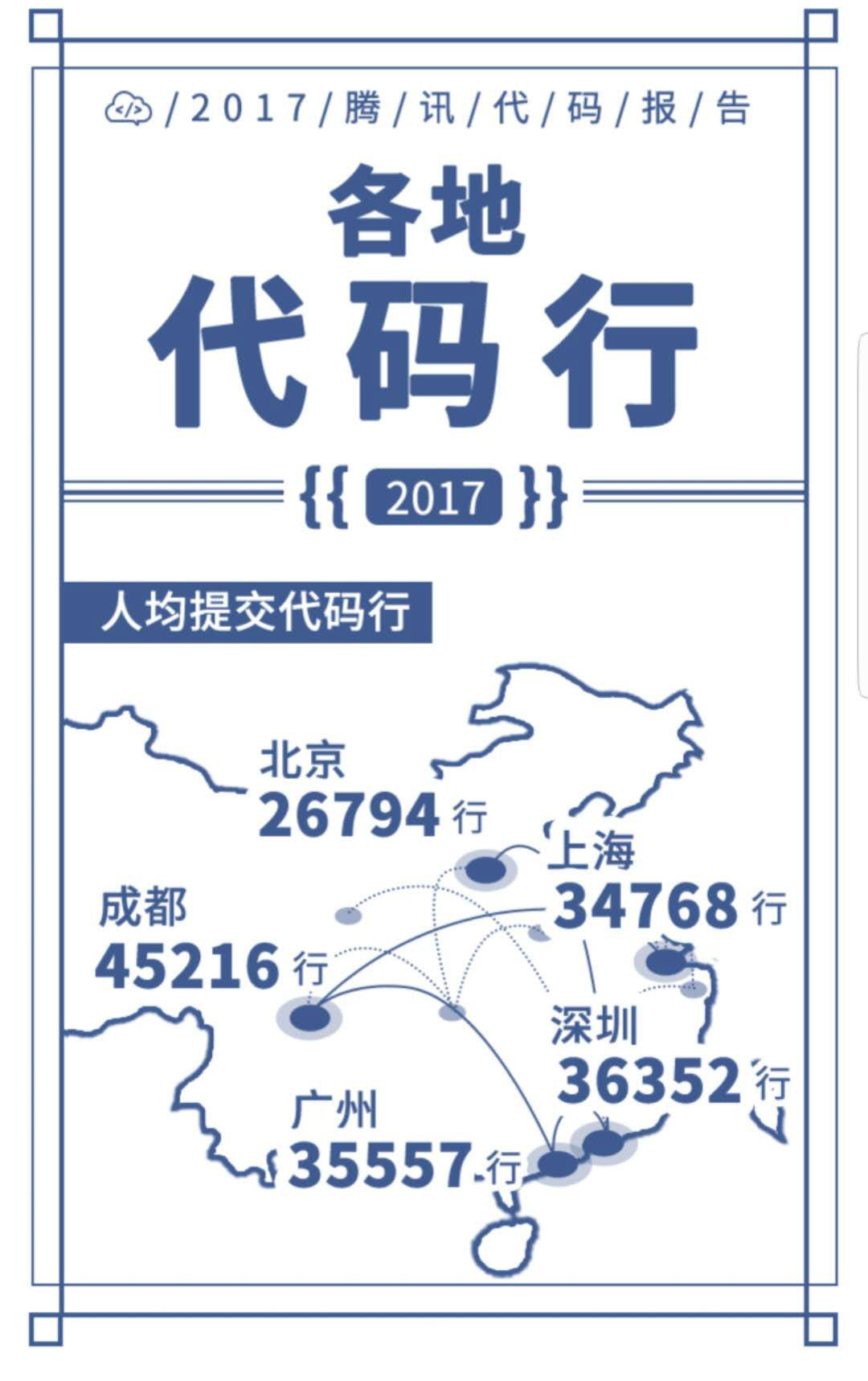 人均提交代码行成都最高,为 45216 行;其次是深圳,36352 行;