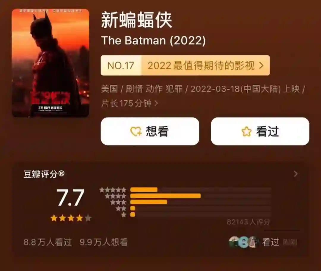 截至3月17日,上映两周的《新蝙蝠侠》全球成绩为4.79亿美元。国内首日票房2132.3万,场均人次仅7人,首周末票房7445.6万。以目前的走势来看,它很难像DC上一部漫改电影《小丑》那样,斩获10亿美元以上。