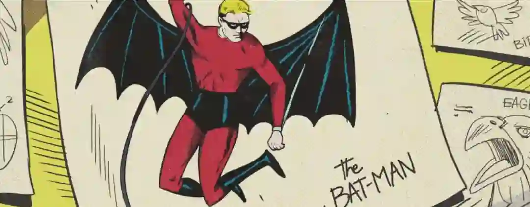 不过凯恩的初稿更像后来的罗宾,“蝙蝠侠”是一个身穿红色紧身衣、戴着窄小眼罩、背后有副翅膀的角色。比尔·芬格赋予了他灵魂:将衣服涂黑更像夜行生物,面具罩住整个头、加上尖耳朵既更像角色名,也能震慑罪犯,翅膀明显不实用,改成边缘圆齿的斗篷,晚上活动时会在他背后飞舞……