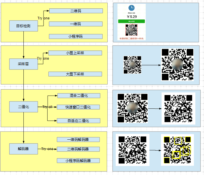 想要解决上面的问题,这里需要简单讲一下目前QBar识别引擎的工作流程,主要流程为:金字塔采样 ->二值化 -> 解码器 ->二维码预判。金字塔采样主要作用为缩小图片以降低后序的运算复杂度;二值化目的是为了让整个解码过程变得简单,毕竟码的信息与复杂的颜色无关,只关注“黑”与“白”;解码器为每种码制的信息提取模块,解码时我们会按顺序遍历每个解码器来尝试解码;二维码预判为我们自研的小码检测算法,主要用于小码自动放大场景。