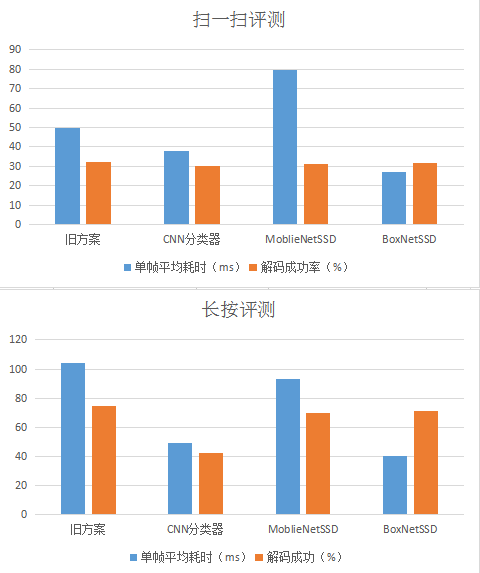 可以看到,在接入了分类器后,QBar的单帧耗时明显下降,可是,识别率同时也下降了,长按场景尤为明显。这里不仅是因为模型准确率没有达到100%,更重要的是,这个方案不能解决一图多码与大图小码的问题。