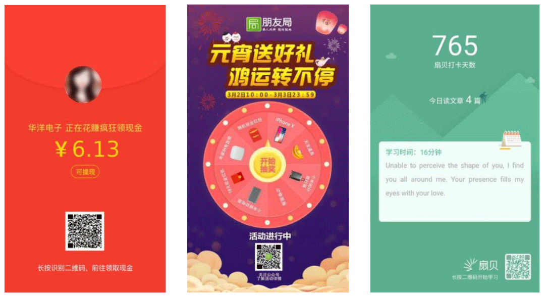 除了一些量化的评测数据,这里给出一些优化后能够成功识别的case。下图给出的3张为朋友圈真实图片,在旧版本的QBar由于码太小,在压缩图的状态下是无法被识别的,但是在新版引擎下,我们已经能够覆盖到这些case。