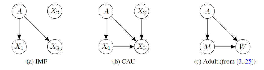 除了合成数据,作者还在 Adult 数据集上进行了实验,数据集的具体介绍可以参照原文,这是一个专门用于 Causal 的数据集,提供了各个属性的名称以及相应的因果关系。