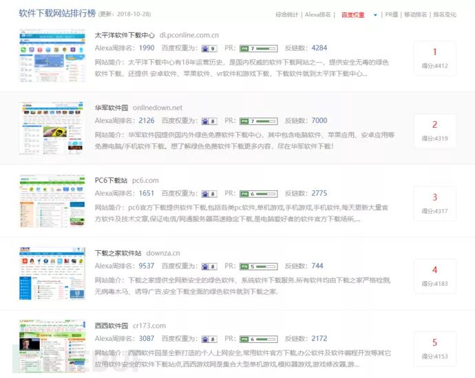 PC端一直是重灾区,而且存在时间也比较久。根据站长工具统计的百度权重数据来看(虽然不是百度官方数据,但也具有比较可靠的参考价值),传统PC端下载站中排名前5的分别如下图: