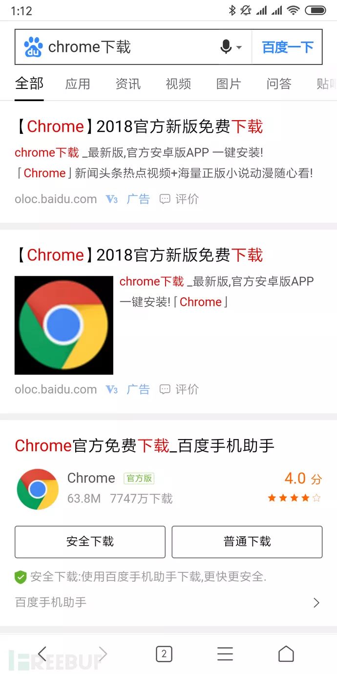 笔者尝试通过手机浏览器百度搜索“Chrome下载”,Chrome官网排在第四条,第一条和第二条均是“oloc.baidu.com”站点的广告,显示为二级域名,第三条则是百度手机助手的入口。