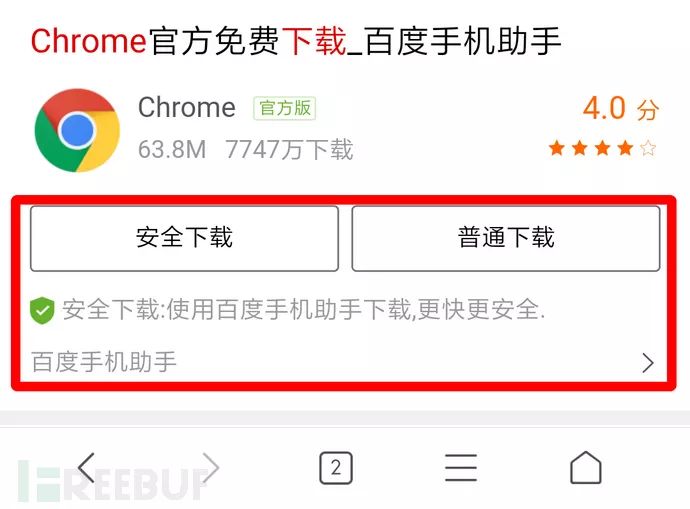 在搜索结果页上可以直接点击下载按钮“安全下载”和“普通下载”,而且已注明需“使用百度手机助手下载”,这里没问题。