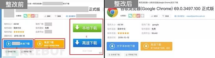 你会发现整改之后的下载区去掉了“高速下载”的广告位,这部分本身就存在诱导下载行为,用户点击之后并不会下载自己想要的软件。