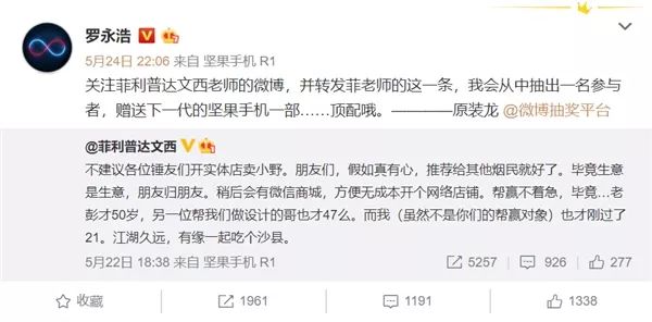 罗永浩转发表示道:“关注菲利普达文西老师的微博,并转发菲老师的这一条,我会从中抽出一名参与者,赠送下一代的坚果手机一部……顶配哦————原装龙。”