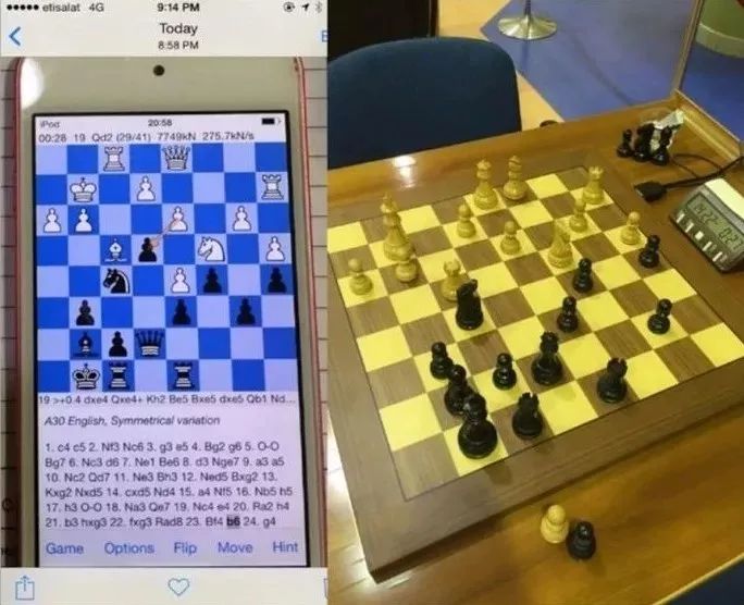 如果说 Rausis 还只是“很有可能”抱 AI 大腿的话,那么2015年迪拜公开赛上同样被抓现行的 Gaoiz Nigalidze 就真是确凿无疑了——他行径败露的时候,手机屏幕上正显示着和现实中一样的对局。