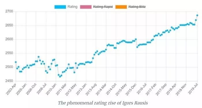 Rausis在过去的几年里让自己的排名分一路突飞猛进,从2500分左右(世界排名2000左右)一路进步到了2686分(世界排名第53名),靠的就是故意和比自己弱的对手对决。