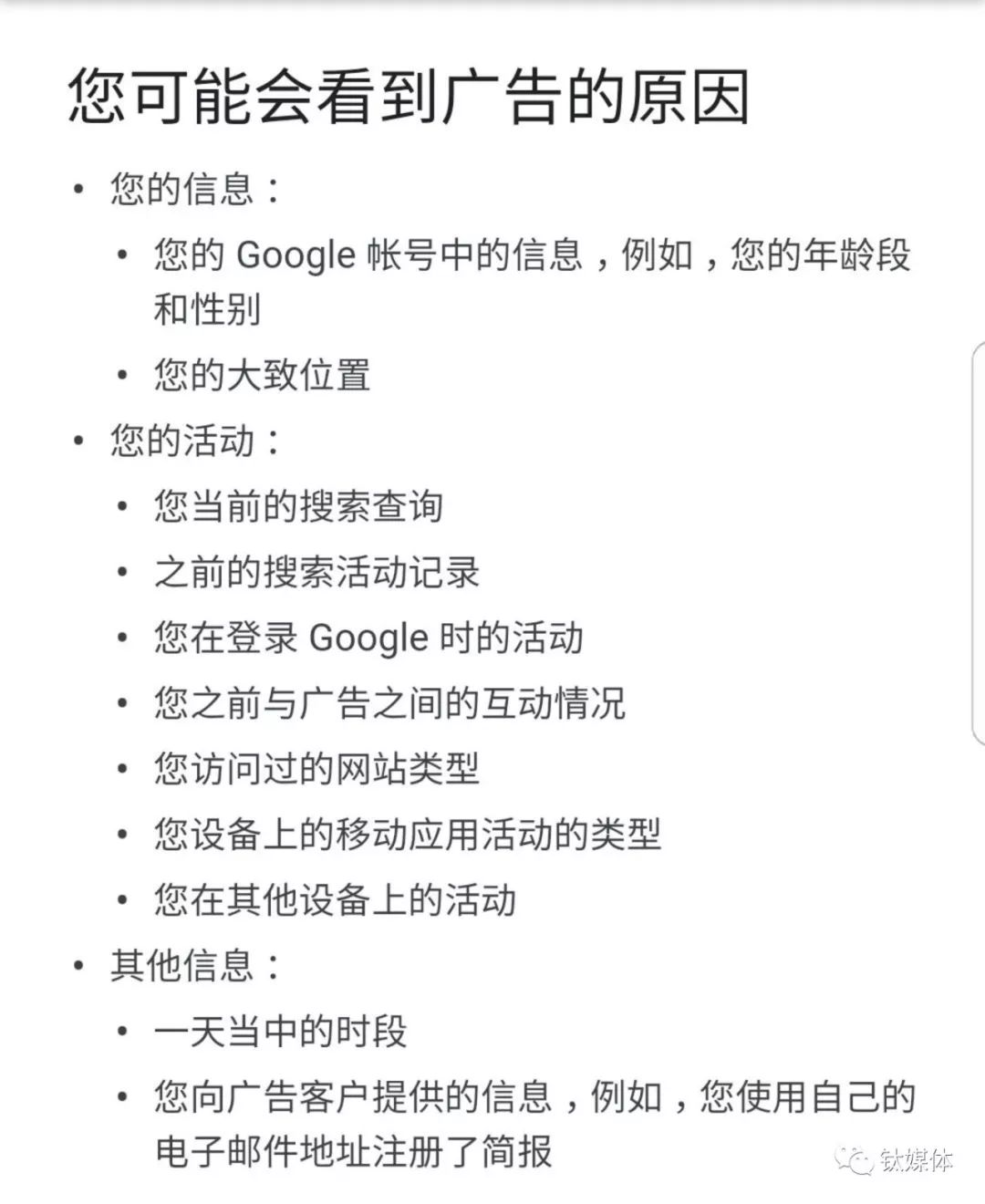 同样,广告和隐私之间也总是存在关系,谷歌也面临着如何妥善处理用户隐私的问题,当谷歌向你推送相关广告的时候,它总是会根据你之前相关信息和行为来进行匹配,甚至谷歌在其广告解释条文中明确地告知广告是根据哪些信息进行推送的,随着政府和公众对隐私问题重视程度越来越高,谷歌也面临着如何在精准广告和保证隐私这二者之间取得平衡。