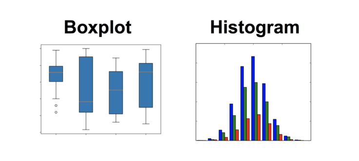 你可以使用矩形图或箱形图可视化连续数据。从矩形图上可以看到分布的中间趋势、离散程度、形态和峰态。注意,矩形图不体现离散值,因此我们有时使用箱形图。
