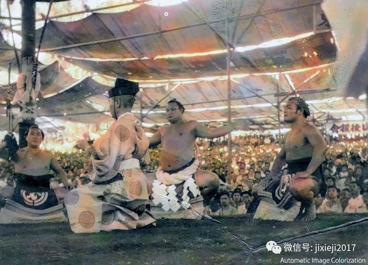 在20世纪30年代拍摄的相扑比赛(摄影师未知)。渡边博士认为中间的摔跤手可能是Futabayama Sadaji。