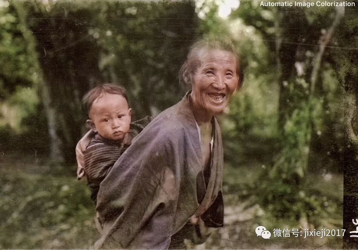 一个老妇人背着一个婴儿。摄影:阿诺德·金哲,1908年。