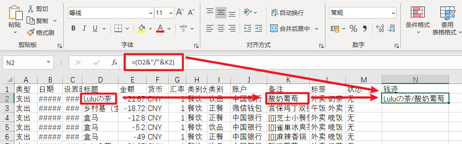 统一消费商户和备注:Bluecoins 的每一笔消费都可以分别设置标题(在哪儿买)和备注(买的啥),这两项数据反映在 .csv 文件中是两栏数据;而钱迹仅提供备注信息,所以需要将 Bluecoins 这两栏数据合并,这里用到的是 Excel 的内容合并函数,比如 A1 栏中是标题「少数派」,B1 栏中是备注「钱迹会员」,那 C1 栏中可以用 =(A1&"/"&B1)将二者合一,变成「少数派/钱迹会员」这样的形式导入到钱迹中。
