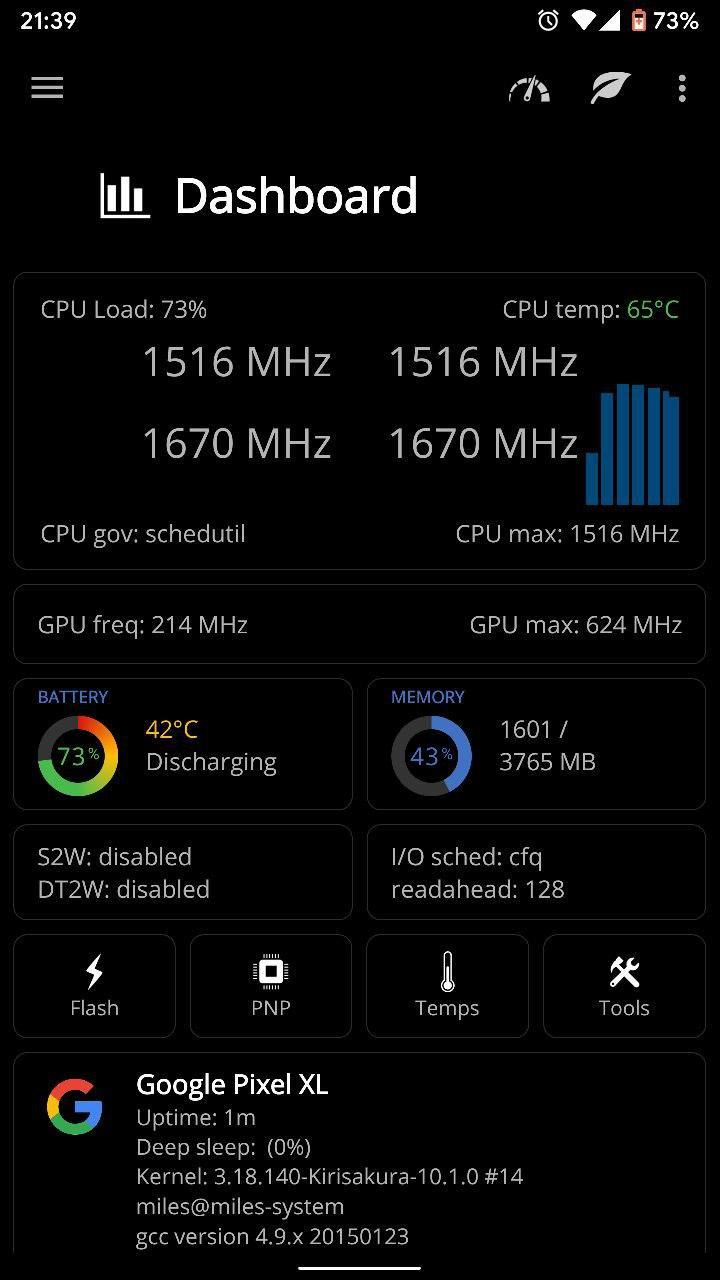 刚解锁当然立刻就刷上第三方内核玩玩看,一瞬间都感觉前几年折腾 Android 的青春又回来了 🌚。初代 Pixel 所移植的 EAS 所用的调度是 sched,也有名为 Kirisakura 的第三方内核移植了成为后续 EAS 主流调度的 schedutil,但这个内核破坏了手机的通话功能,让我漏接了好几个电话(也怪我没有仔细看后续的帖子)。