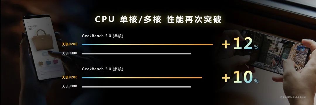 天玑 9200 相比天玑 9000 的 Geekbench 5 CPU 单核性能提升 12%,多核性能提升 10%。
