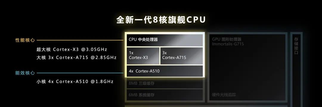 为了提升性能,联发科甩掉了 32 位应用的历史残留——但没完全甩掉。CPU 的 X3 超大核、A715 大核都仅支持 64 位应用,仅有 A510 小核心可以跑老 32 位应用。