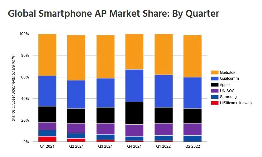从入门级的天玑 700 到中高端的天玑 1000、天玑 1200,以及旗舰级的天玑 9000,发哥收获了良好的市场反响。过去一年多的时间里,联发科智能手机处理器的市场份额保持在 40% 左右,稳坐第一。
