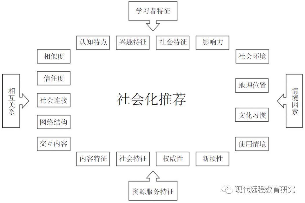 社会化推荐系统在教育领域也逐渐引起研究者的关注。有研究者以建构主义学习理论为基础,利用本体论技术,结合协同过滤推荐算法,提出了社交网络环境下基于本体的学习推荐系统架构和功能(吴正洋等,2016)。也有研究采用将学习者社交网络信息与传统协同过滤相融合的方法,计算新学习者与好友之间的信任度,来预测新学习者对学习资源的评分值,以实现对新学习者的个性化学习资源推荐(丁永刚等,2016)。但这些研究仅考虑了单一或分散的社会要素,并没有对大规模在线学习中的社会化要素进行全面系统的分析。另外对用户关系考虑也比较简单,缺少对隐性用户关系的发现与挖掘。这些问题使得现有的社会化推荐系统研究难以支持教育领域的实际应用。