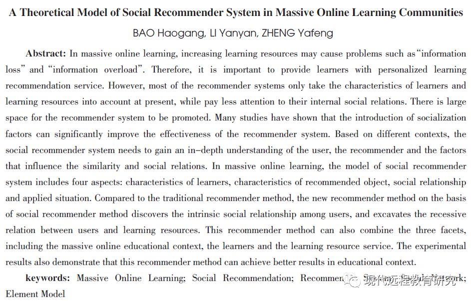 引用:包昊罡,李艳燕,郑娅峰(2018).面向大规模在线学习的社会化推荐模型与方法[J].现代远程教育研究,(3):94-103.