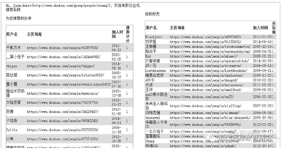 社会化推荐的重点是收集在线学习社区中学习者之间的社会交互数据。因此,根据研究需要,为了突出社会关系属性,本研究选取了来自豆瓣网的两个小组——“教育大发现”(https://www.douban.com/group/SocialLearnLab/)以及“实践蒙台梭利”(https://www.douban.com/group/123776/)作为数据来源。自动收集了小组成员、成员对物品的评分信息以及成员的相关社交信息。成员评论的物品选取了评论人数较为密集的“图书”作为推荐资源,成员的社交信息包括成员关注的人、关注该成员的人以及成员加入的小组名称。本研究所收集的数据如下: