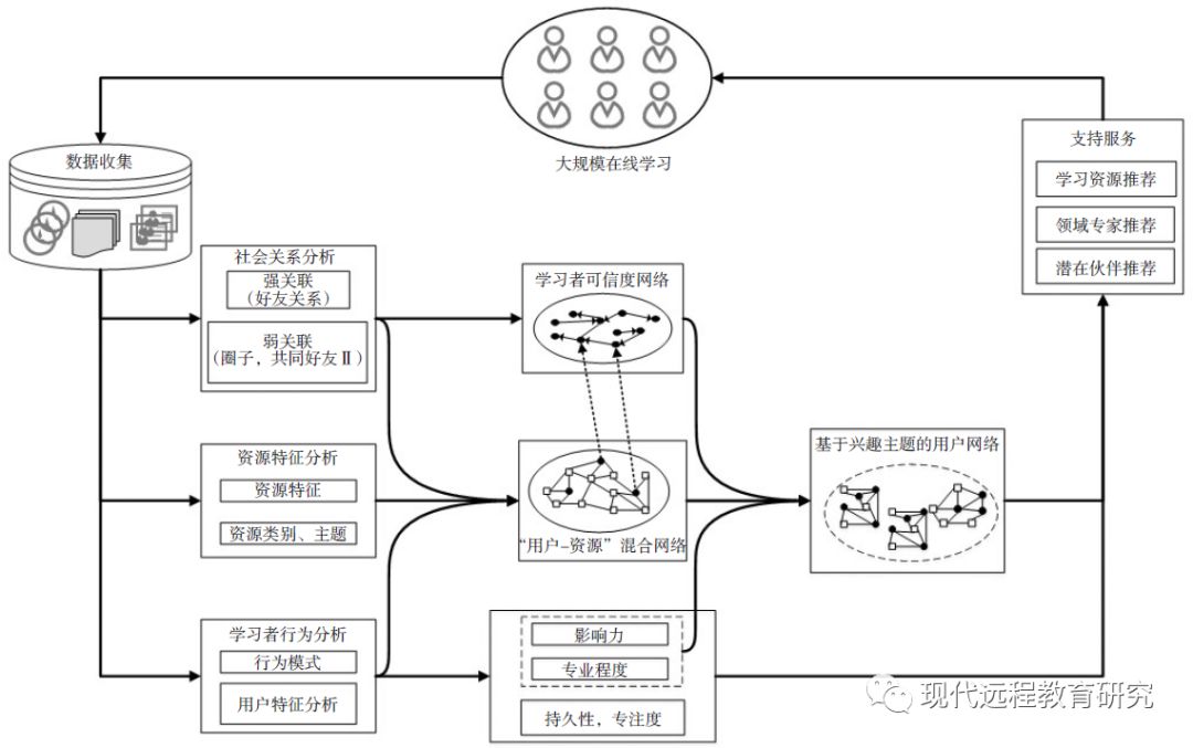 大规模在线学习是在线学习的未来发展趋势。为学习者提供个性化的推荐服务是大规模在线学习的重要任务。个性化学习的支持,最重要的是对学习者更加深入和充分的理解。在社交网络逐渐普及的今天,学习者越来越多地利用社交网络进行交流与学习。一个好的在线学习社区,不仅需要建立学习者可以相互协作和交流的社会空间,而且需要建立有效的社会化推荐服务,帮助学习者找到合适的伙伴、专家和资源,建立学习共同体,促进学习者完成深度学习。
