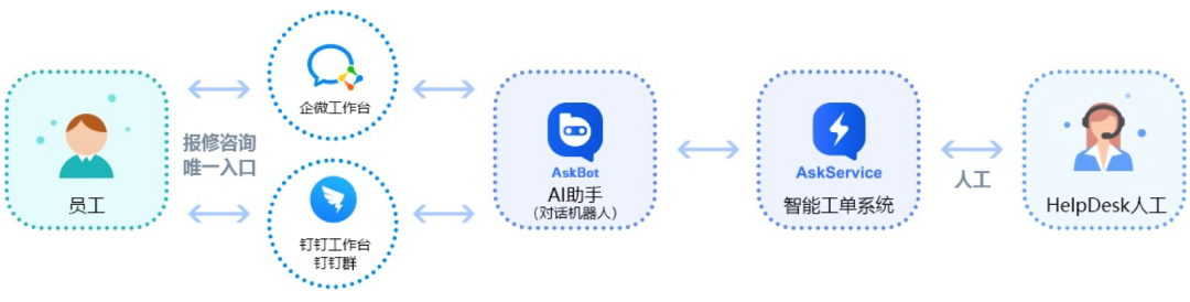 AskBot可以理解员工意图并给出解决方案,对于机器人无法解决的问题,自动发起执行流程转交人工处理、事后评价,实现人机协同服务闭环。