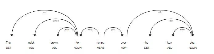 让我们来看下这句话的依存分析结果:「The quick brown fox jumps over the lazy dog」。
