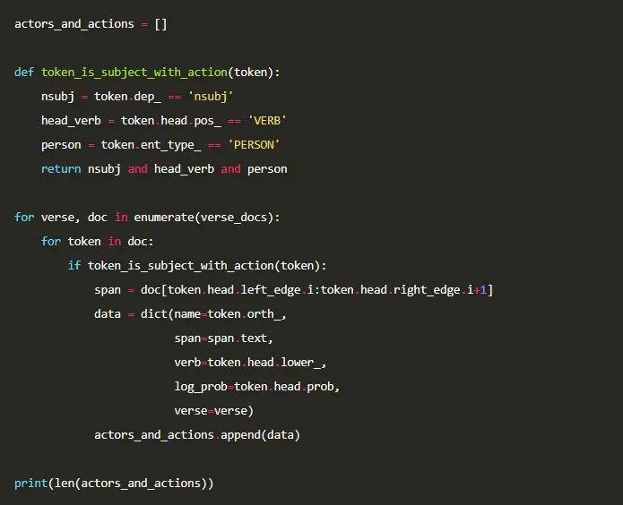 在我们导入的数据中,每一个对象就是一段圣经中的经文。经文是用来索引圣经中的具体章节,一般包括一句或若干句文本。我们会遍历每段经文,提取其中的主语,判断其是否是人名,并抽取出该人物的行为。