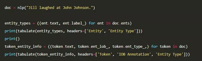在下面的代码中,我们使用docs.ents函数打印出所有文档级的命名实体。接着,我们打印出每一个词条,它的 IOB 标注及所属的实体类型(如果该词条是某个实体一部分的话)。