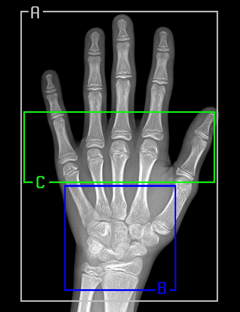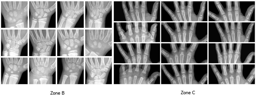 遵循 Gilsanz 和 Ratib 的《Hand Bone Age: a Digital Atlas of Skeletal Maturity》,我们从经过配准的放射影像中选择了三个特定区域,针对每一个区域训练了一个单独的模型:
