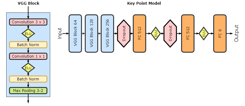 再说一次,特征点模型是受一系列 VGG 族模型启发、通过深度卷积神经网络实现的回归模型。VGG 模块由两个带有指数线性单元激活、批归一化和最大池化的卷积层组成。下图是其架构: