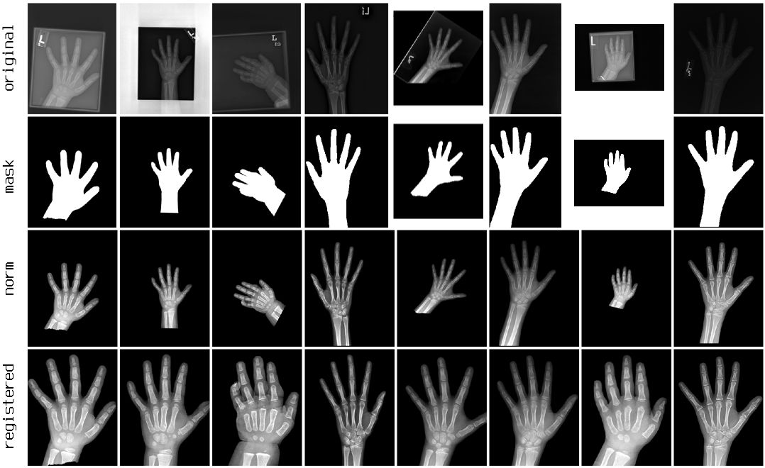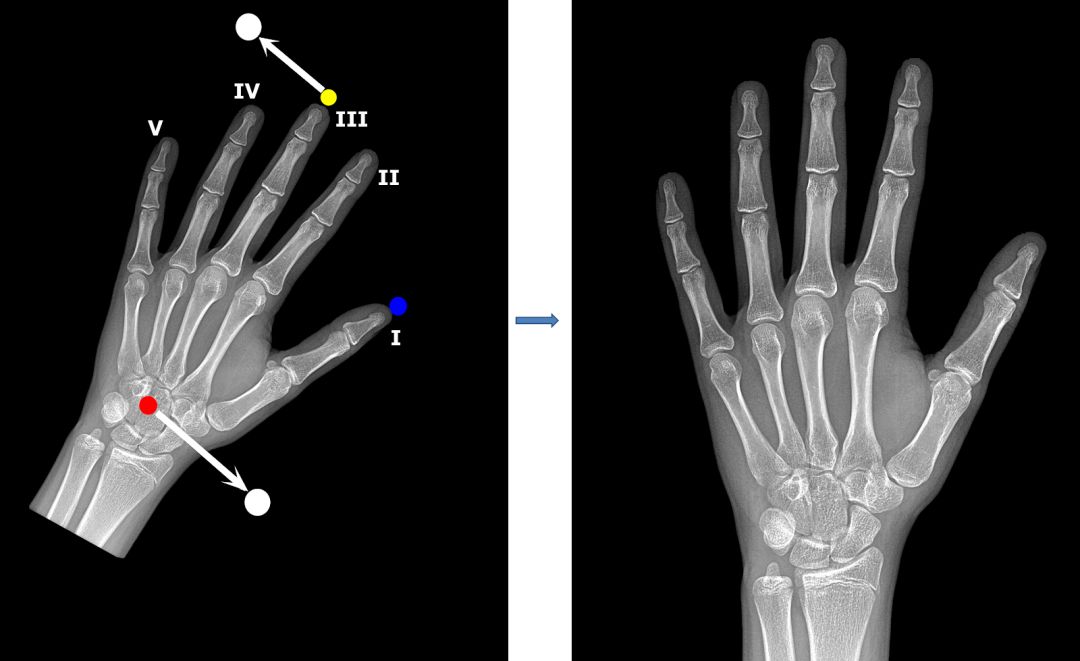 我们的图像配准策略很简单:检测手骨中几个特征点的坐标,然后计算仿射变换参数(缩放、旋转、平移和反射),使图像与标准位置一致。