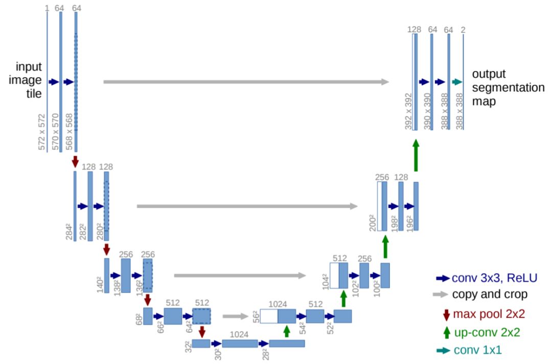 我们用 U-Net 深度架构(https://arxiv.org/abs/1505.04597)进行图像分割。自 2015 年 U-Net 出现以来,它就成为分割任务中的主力。它由一个获取上下文信息的收缩路径(contracting path)和一个用于精准定位的对称扩张路径(symmetric expanding path)组成;因为本文主题不是 U-Net,我们简单地展示一下其架构即可,细节请参阅论文。