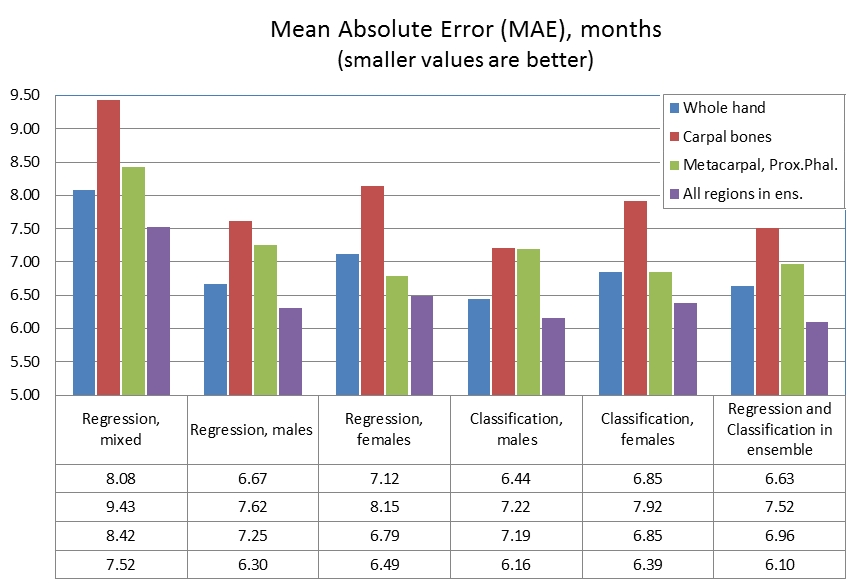 结果证明在输入中添加性别可以将模型准确率平均提高 1.4 个月。最左边这一列表示针对两个性别的回归模型的表现。掌骨和近端指骨区域(区域 C)的 MAE 为 8.42 个月,整个手骨(区域 A)的 MAE 为 8.08 个月。对这三个区域进行线性集成可以将准确率提高到 7.52 个月(表中最后一行)。
