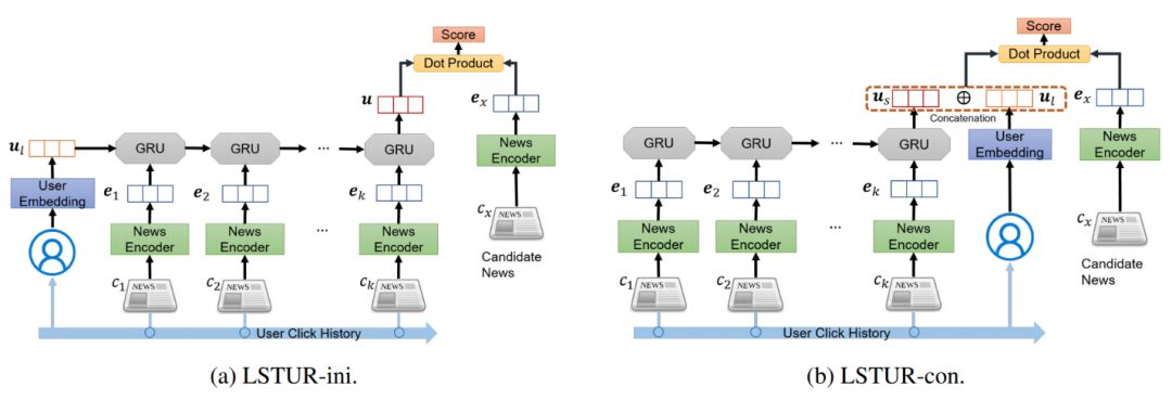 用户短期兴趣表示模块用于从用户近期点击过的新闻历史中学习用户的表示向量,然后将这些点击的新闻的表示向量按时间顺序依次通过GRU模型得到用户短期兴趣表示。用户长期兴趣表示模块则是从用户的ID中学习用户的表示向量。对于如何同时学习用户长期和短期的兴趣表示,该论文提出了两种结合方式:(1)将用户长期兴趣表示作为用户短期用户表示计算中GRU的初始状态(LSTUR-ini);(2)将用户长短期兴趣表示拼接作为最终用户表示(LSTUR-con)。候选新闻的个性化分数通过用户表示向量和新闻表示向量的内积计算,作为众多候选新闻针对特定用户个性化排序的依据。