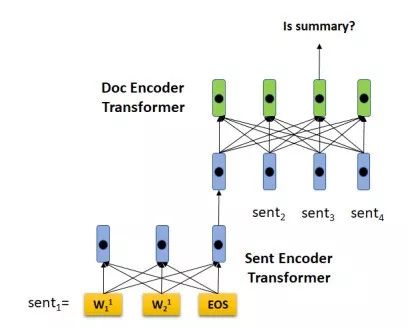 如图1所示,HIBERT的编码器是一个Hierachical Transformer(句子级别的Transformer和文章级别的Transformer)。句子级别的Transformer通过句内信息学习句子表示,而文章级别的Transformer通过句间信息学习带上下句背景的句子表示。