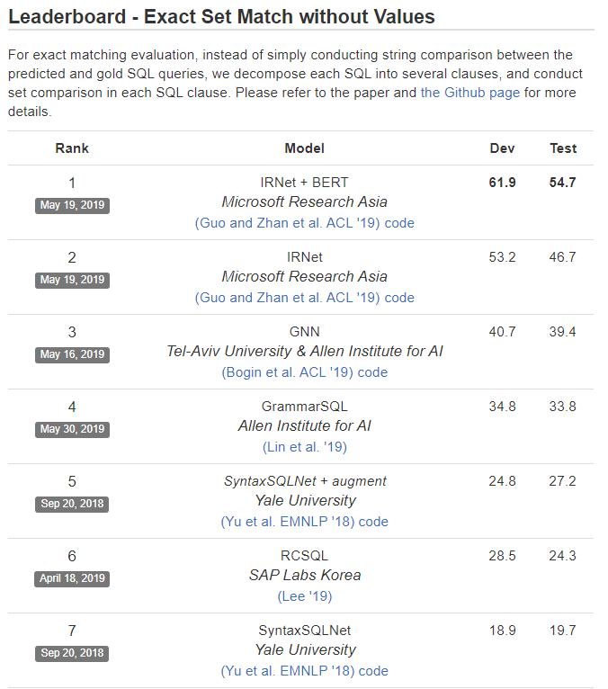 到目前为止,微软亚洲研究院的IRNet模型在Spider Challenge比赛上取得了第一名的成绩。
