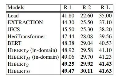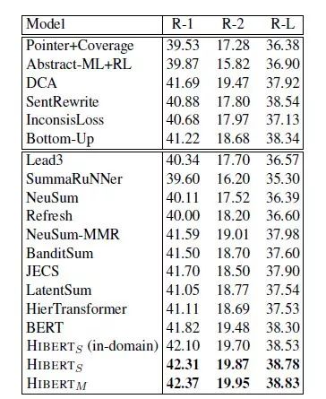 HIBERT在两个著名的摘要数据集CNN/DailyMail和New York Times上结果都表现很好,超越了BERT及其它在2018年和2019年初提出的所有摘要模型。