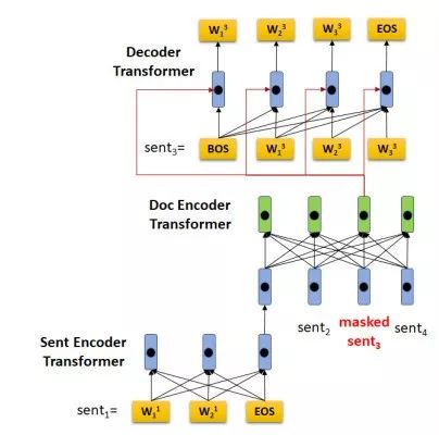 与BERT类似,HIBERT需要先进行无监督的预训练(pre-training),然后在下游任务上进行有监督的微调(finetuning)。HIBERT预训练的任务是掩盖(MASK)文章中的几句话,然后再预测这几句话。如图1所示,文章的第三句话被MASK掉了,我们用一个Decoder Transformer去预测这句话。