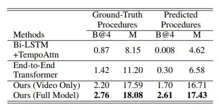 表7:不同模型在YouCook II数据集的Procedure Captioning任务上的实验结果